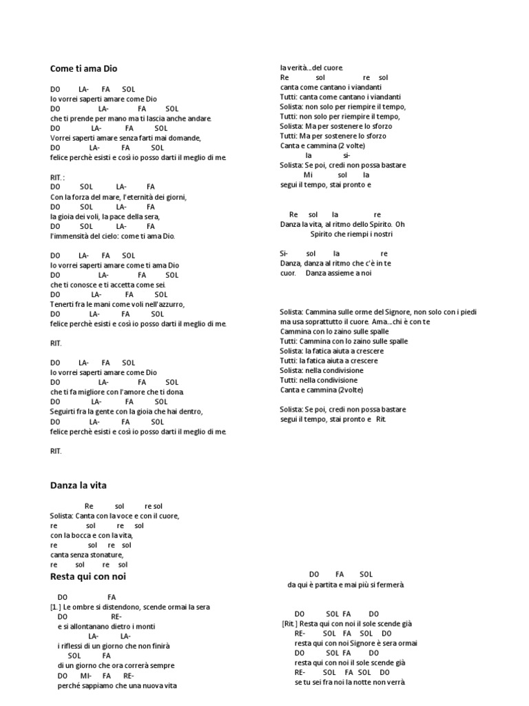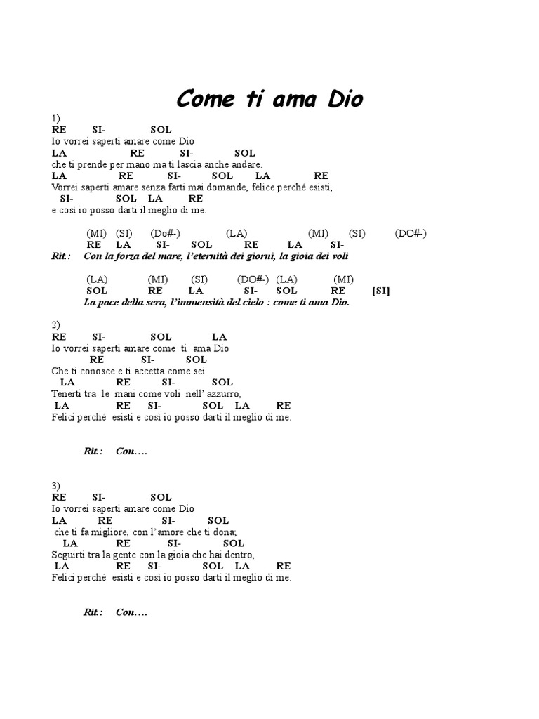 Vorrei saperti amare senza farti mai domande. 19 re si sol7 la re si sol io vorrei saperti amare come dio la re si sol che ti prende per mano ma ti lascia anche andare la re si sol vorrei saperti amare senza farti mai domande. Nel riflesso di un soffio più mio. Come ti ama dio pag.